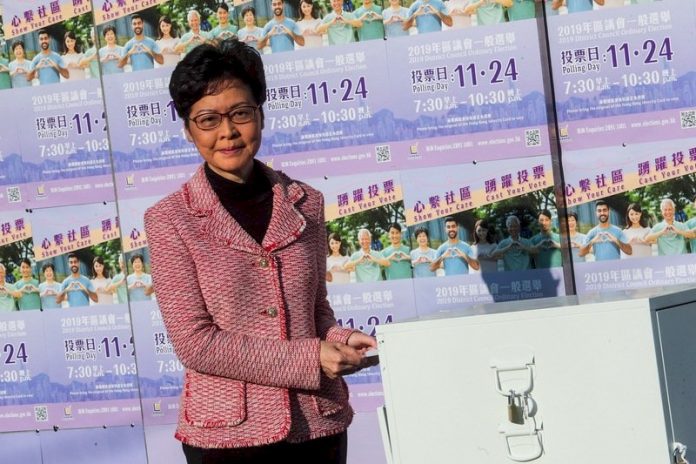 香港近日抗爭情勢逐漸趨緩,24日區議會選舉如期舉行,香港特首林鄭月娥上午前往高主教書院投票站投票,將選票投入票箱。(圖:中央社)