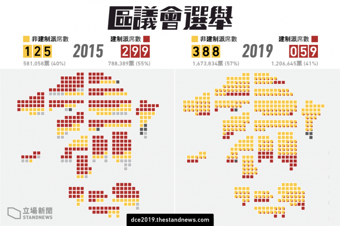 香港第六屆區議會選舉於11月24日舉行,投票率高達71%,創下1997年以來新高,計有逾280萬人參與投票。在持續對立的時局下,以泛民主派為主的非建制派取得壓倒性勝利。截至11月25日下午1時,在全港十八區總計452個議席中,非建制派取得388席,較上屆增加263席,取得各區區議會控制權;親政府的建制派則慘敗,僅取得59席。得票方面,非建制派總票數約167萬票,建制派為120萬票。