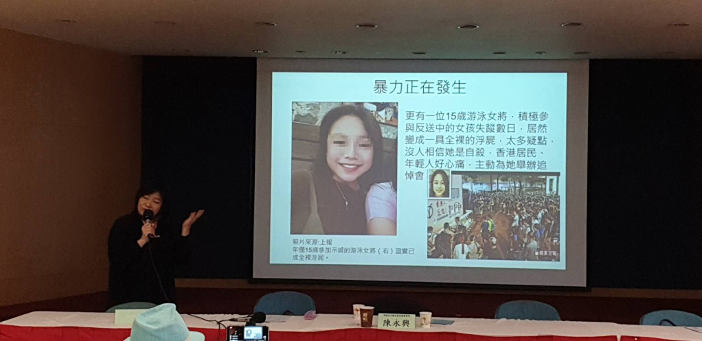 她說,香港一位15歲游泳女將,積極參與反送中的女孩失蹤數日,居然變成一具全裸的浮屍,太多疑點,沒人相信她是自殺;警方鎮壓手段日漸激烈,不僅遭外界質疑執法過當,甚至屢屢對女性示威者與市民實施性暴力手段鎮壓,包括不當觸摸示威者隱私部位,包括胸部、大腿內側等,更以「違法」為由,對示威女性全裸搜身;中文大學女學生,在學校聚會中,脫下口罩,聲淚俱下向校長控訴,許多被捕者在新屋嶺遭受警方性暴力,「被不止一名警員不分性別地性侵及虐待」,她請求校長段崇智同行,發聲譴責警方性暴力。