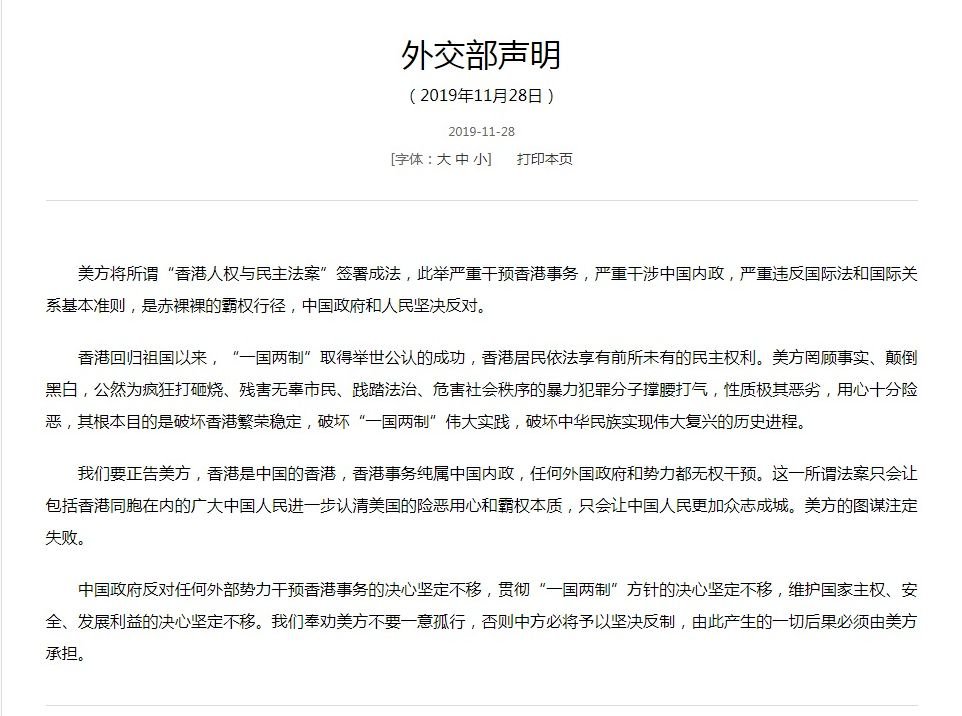 中國外交部在聲明中表示,此舉「嚴重違反國際法和國際關係基本準則」,並指責美國為「危害社會秩序的暴力犯罪分子撐腰打氣…其根本目的是破壞香港繁榮穩定。」