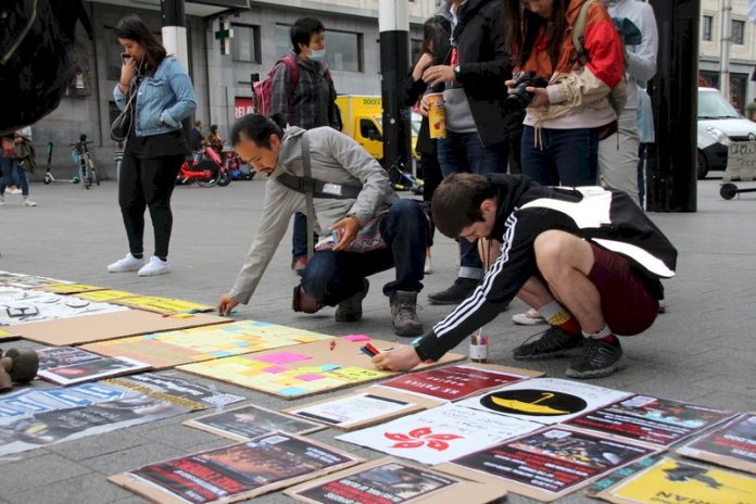 6日晚間有數十位居住在布魯塞爾的香港民眾,齊聚在市中心的中央車站前廣場發起撐香港集會,他們除在地上展示許多張關於警察暴力對待市民、香港人權危機以及爭自由等許多張海報外,並提供留言區,吸引許多人注目。
