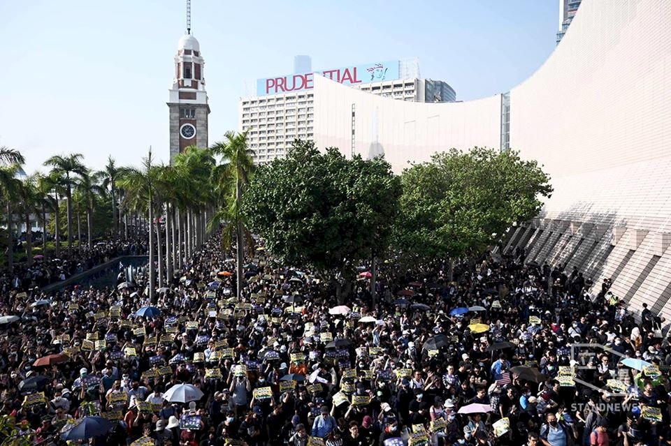 今天下午2時,尖沙咀鐘樓已有近百名市民聚集,他們大部分身穿黑衣,戴上口罩,有人揮動美國國旗,高叫「五大訴求,缺一不可」等口號。現場也有人發送瓶裝水及口罩。