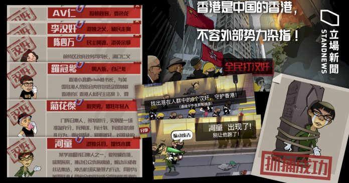 中國近日出現一款免費網路遊戲「全民打漢奸」,多名「反送中」運動領袖如黃之鋒被設計成「通緝犯」,供玩家打擊。(圖: 立場新聞)