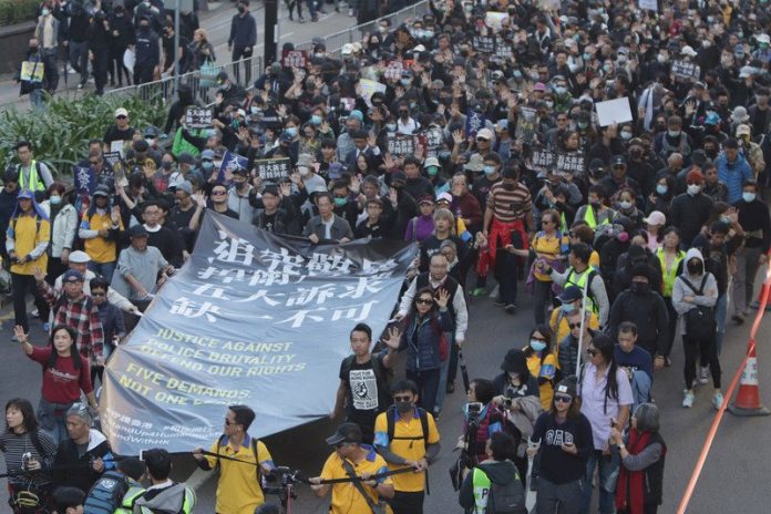 香港民陣8日發起遊行,遊行隊伍從銅鑼灣出發的時候,眾人手持巨型橫幅,上面寫著「追究警暴,捍衛人權,五大訴求,缺一不可」。(中央社)