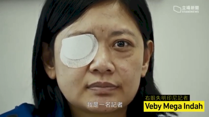 印尼女記者英達(Veby Mega Indah)在香港報導反送中抗爭期間,遭港警發射疑似橡膠子彈擊中右眼失明。(翻攝自立場新聞)