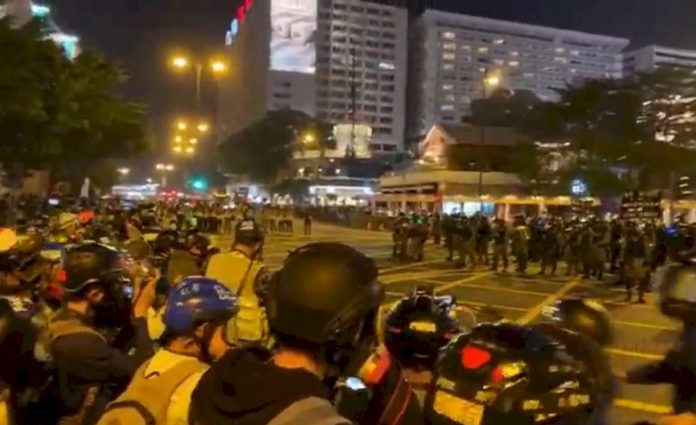 隨後警方在梳士巴利道及彌敦道交界設防線,又舉起藍旗,表示有人向警方扔雜物,令警員受傷,要求聚集人士離開。