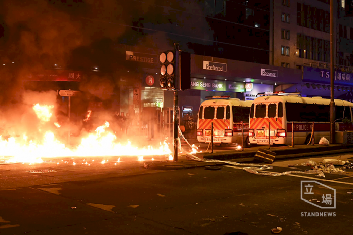旺角有示威者投擲汽油彈,警員發射射催淚彈、胡椒球彈。(立場新聞提供)