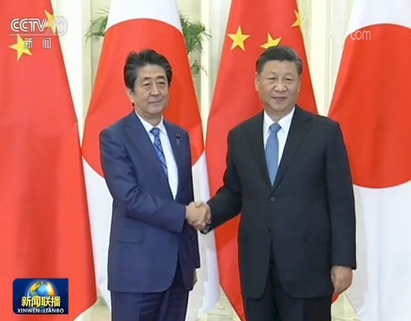 日本首相安倍晉三23日在北京人民大會堂與中國國家主席習近平會晤時,曾對香港和新疆局勢表達關切,習近平則以 「這是中國內政」一語帶過。。(翻攝自央視新聞畫面)