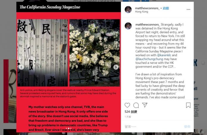 香港媒體報導,美籍攝影師康諾斯(Matthew Connors)月初入境香港時遭扣留訊問,之後被拒絕入境。此前康諾斯曾赴港拍攝「反送中」抗爭,並一度被捕,但未遭控罪。港府則表示不評論個案。