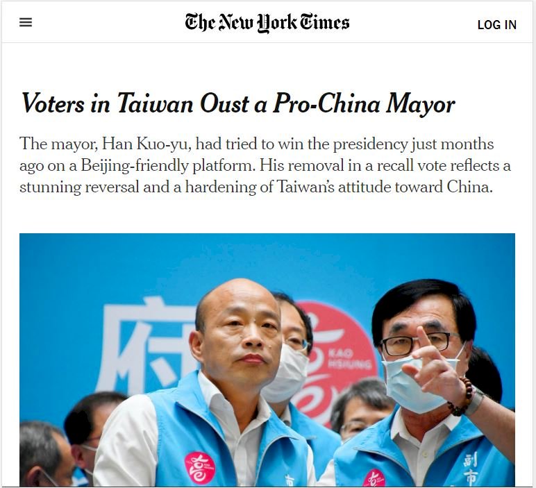 高雄市長韓國瑜罷免案以逾93萬票過關,成為首位遭罷免的直轄市長。紐約時報報導,韓國瑜以親北京政見競選總統,最終敗選,這次罷免投票結果反映出台灣對中國態度日趨強硬。