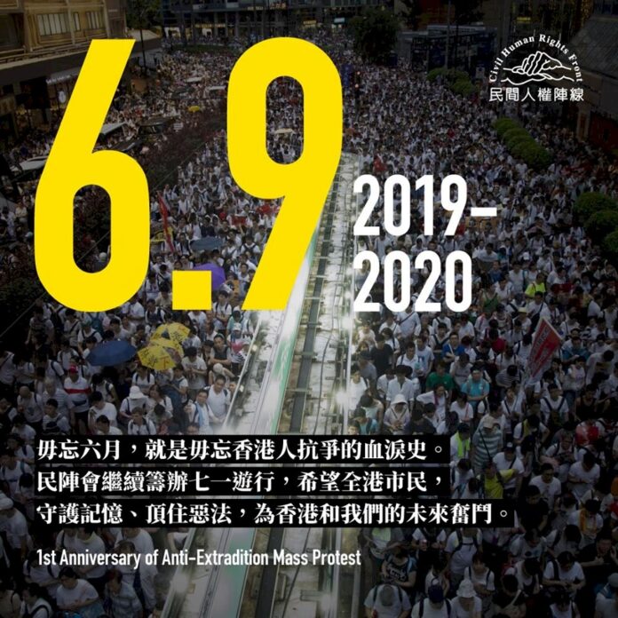 香港「反送中」運動今天(9日)踏入一週年,民間人權陣線發表「反送中百萬人大遊行一週年聲明」,重申「5大訴求,缺一不可」,呼籲抵抗港區國安法,也稱將繼續籌辦「7.1」遊行。