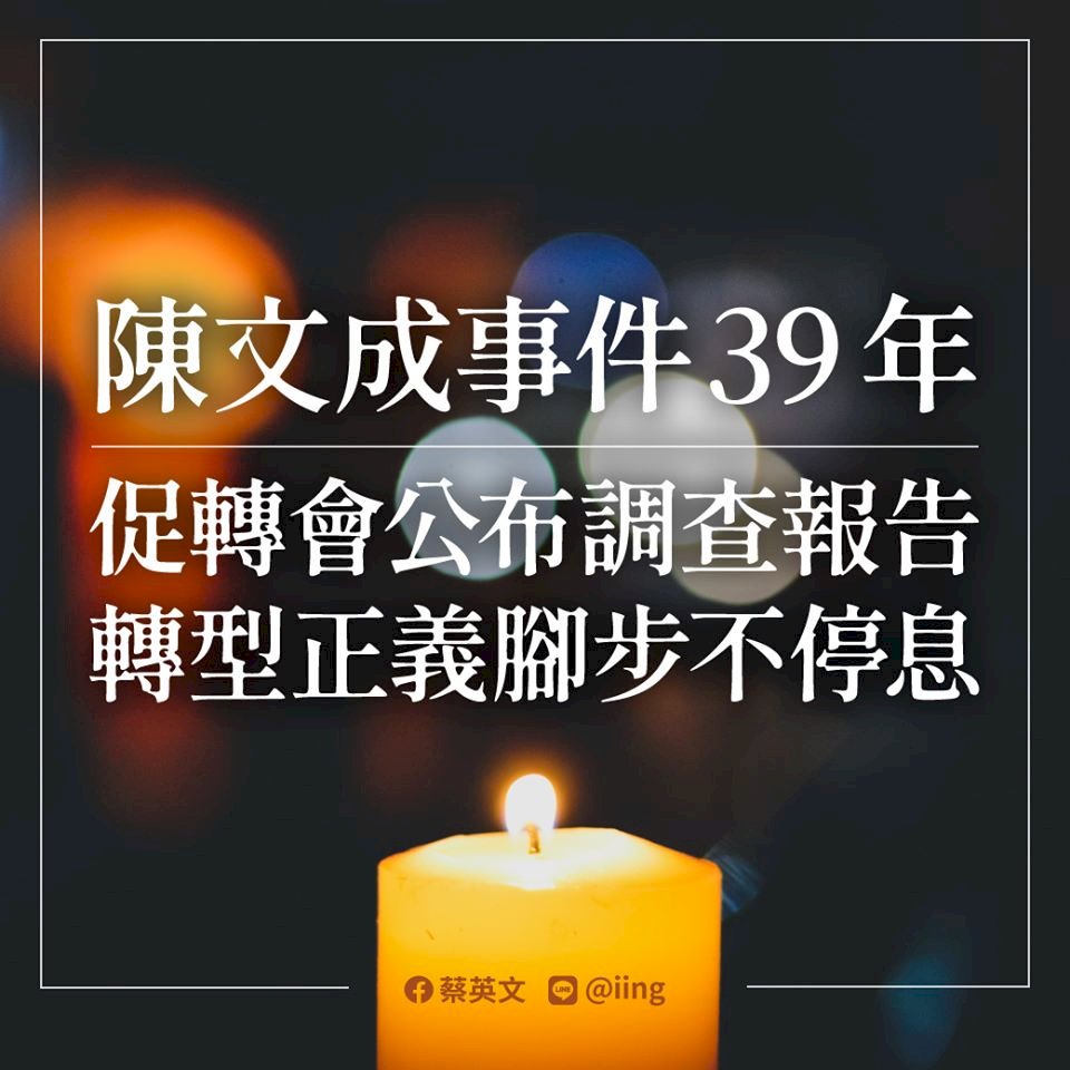 今天(2日)是陳文成事件39週年,蔡英文總統上午在臉書貼文,表示當年在威權統治時期,台灣的年輕人曾莫名被逮捕、被關押,甚至失去生命,如今我們試圖在時間洪流中努力找回真相。