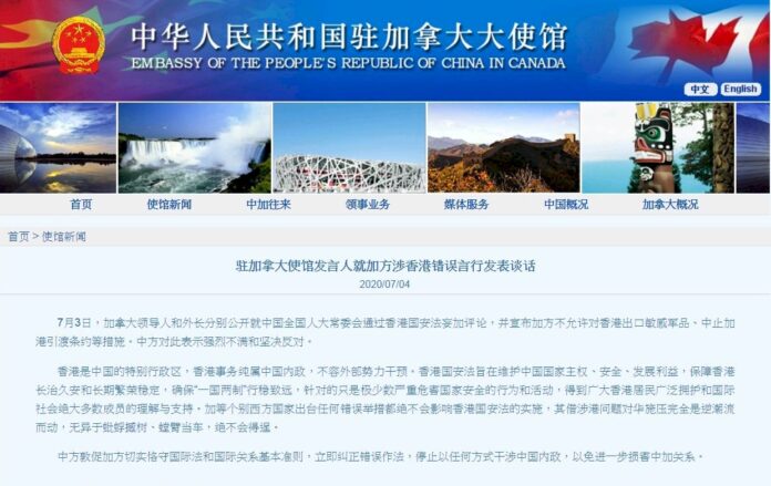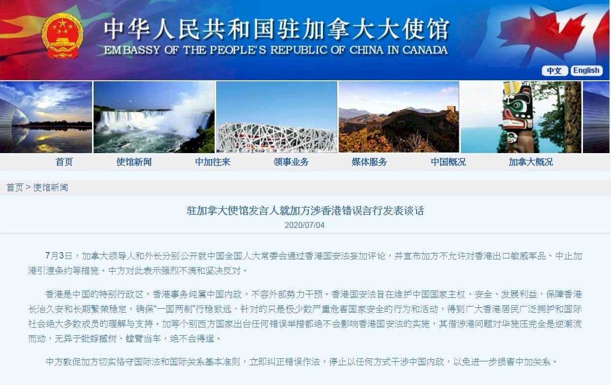 對此,中國駐加使館官網3日刊出發言人談話稱,加拿大領導人和外長分別公開就中國全國人大常委會通過港區國安法「妄加評論」,並宣布加方不允許對香港出口敏感軍品、中止加港引渡條約等措施。「中方對此表示強烈不滿和堅決反對」。