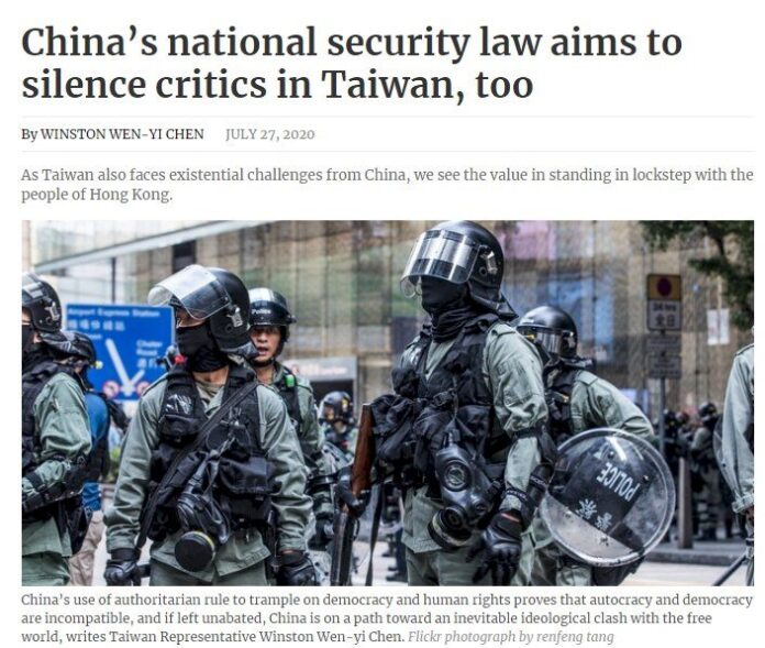 陳文儀在「國會山莊時報」以「中國的國安法也意圖讓台灣批評者噤聲」為題寫道,加拿大政府果斷暫停加港引渡協定,值得讚許;此舉代表加拿大已認知香港不再擁有獨立於中國法律的自治權,並對中國壓制香港民主的意圖進行反制。