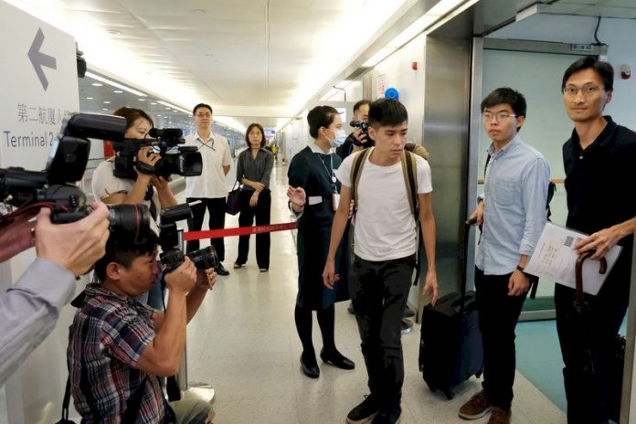 香港眾志秘書長黃之鋒(右2)、香港專上學生聯會前副秘書長岑敖暉(右3)、香港立法會議員朱凱迪(右)3日上午搭機從香港抵達桃園國際機場。(圖:中央社)