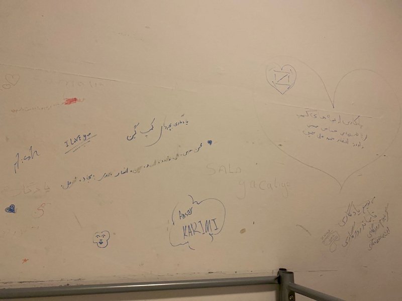 參與反送中運動的香港年輕人Elaine逃亡到德國申請庇護,在難民營拍下這張照片,其它難民因思念家人在牆上的留言,讓她想到香港的親友。(圖:中央社)