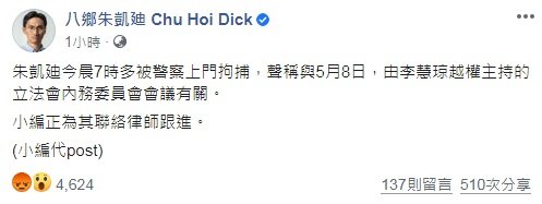 香港立法會前議員朱凱廸透過社群平台臉書表示,上午7時許被警方拘捕,警方指和5月8日立法會內委會事件有關。(圖截自朱凱迪臉書)