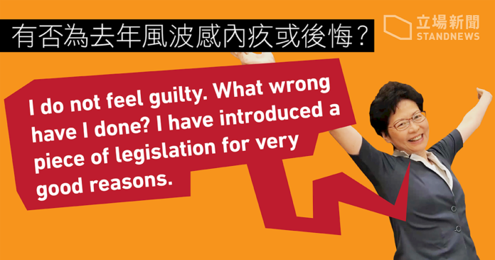 香港特首林鄭月娥接受《南華早報》專訪,林鄭月娥在專訪中對於香港去年的經歷社會動盪(反送中運動),她表示沒有感到內疚,反問「我做錯了甚麼?」(立場新聞提供)