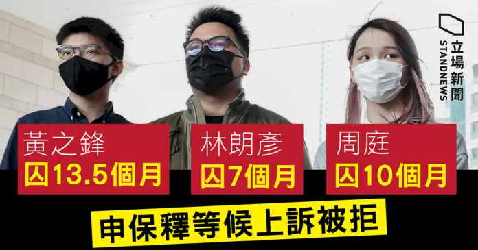 黃之鋒被判監禁13個半月、林朗彥監禁7個月,周庭監禁10個月,法庭並且要他們「即時監禁」,周庭申請保釋等候上訴被駁回。