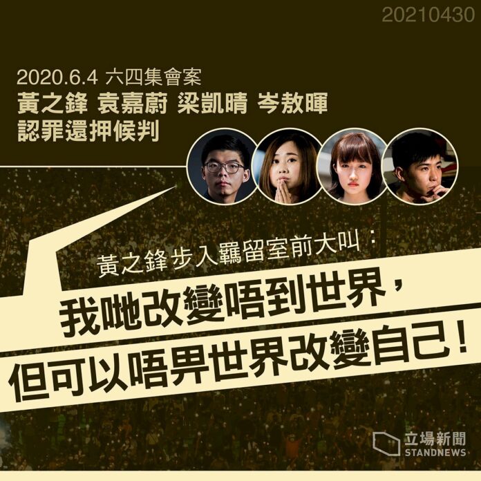 違反官方禁令參與六四燭光晚會,黃之鋒、袁嘉蔚、梁凱晴及岑敖暉 4 人庭上認罪。(圖:立場新聞)