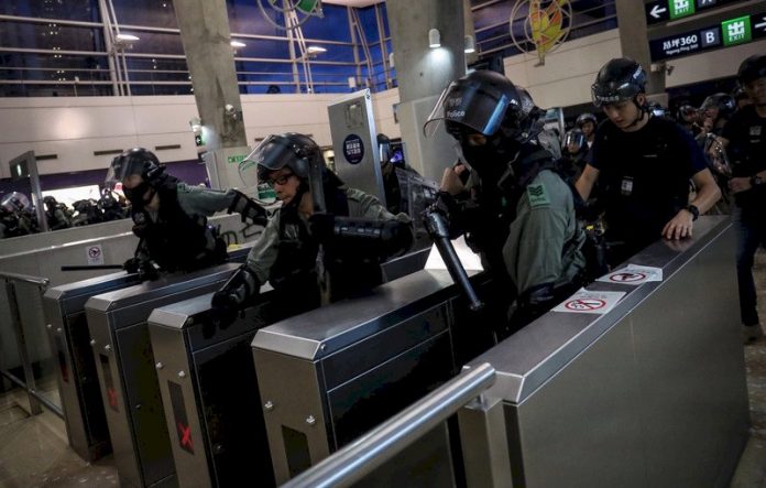 香港反送中運動延燒,部分示威者1日進入地鐵東涌站進行破壞,鎮暴警察晚間集結進入東涌站,展開驅離行動。(圖:中央社)