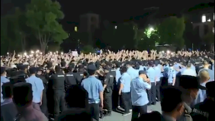 日前江蘇省南京師範大學中北學院大批學生廣場集會拉布條呐喊訴求,政府派出大批防暴員警到現場。(圖:截自網路)