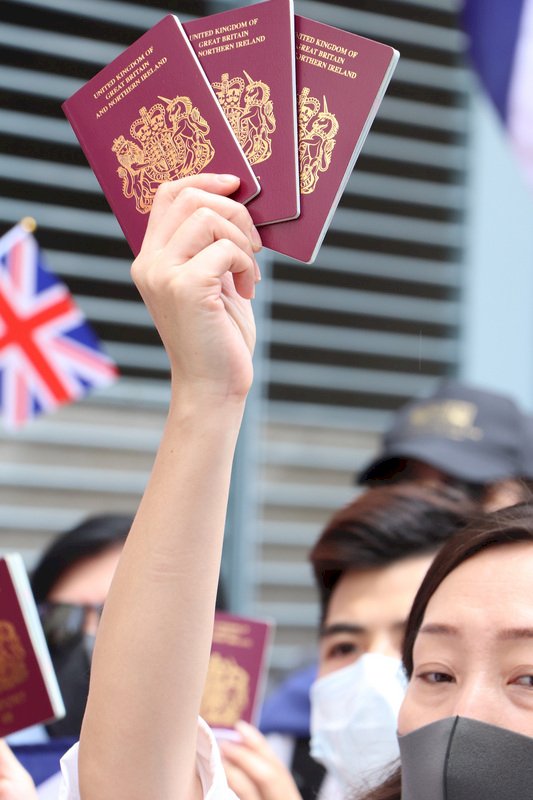 大批港人1日到英國駐香港總領事館請願,要求英國給予公民身分,圖為請願者手持英國發給港人、沒有居英權的海外(公民)護照。(圖:中央社)