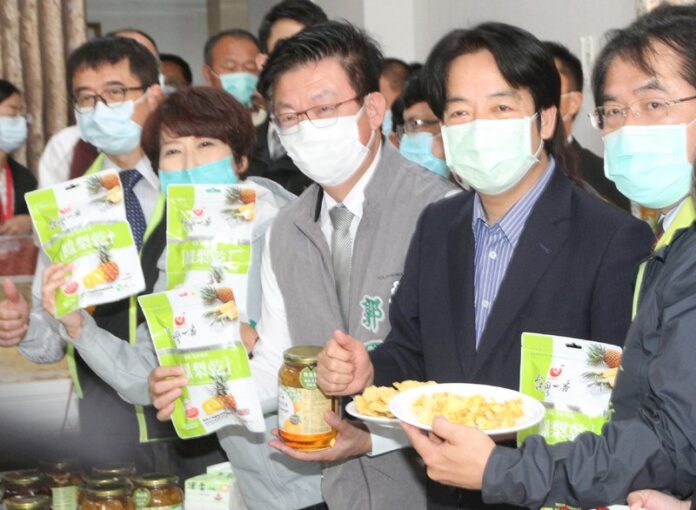 前美國國務卿蓬佩奧(Mike Pompeo)在推特貼出一張吃台灣鳳梨乾的照片,照片中那包鳳梨乾來自台南市官田區的果乾工廠,2月28日台南市長黃偉哲(右1)才陪同副總統賴清德(右2)前往參訪過。 (圖:中央社)