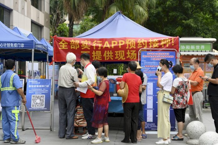 中國廣東省廣州市疫情持續延燒,廣州南沙區5日宣布全區所有公共交通工具停運。圖為廣州市民日前在社區衛生服務中心諮詢疫苗預約流程。(中新社提供 / 圖:中央社)