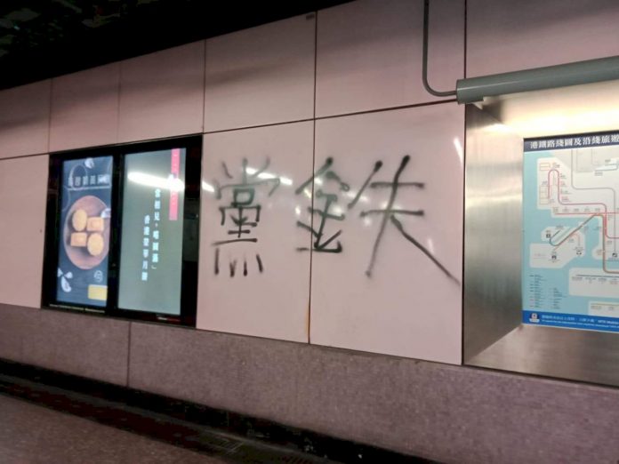 香港地鐵站被人噴寫「黨鐵」,意指共產黨的地鐵。(黃美珍拍攝)