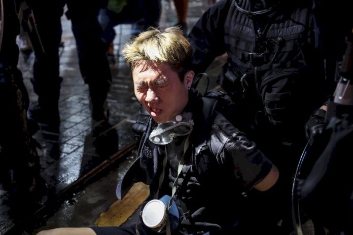 香港電台報導,香港民眾今天(31日)發起831遊行,入夜後,警察和示威者在銅鑼灣對峙,現場所見,至少有兩名身穿黑衣、戴頭盔面罩、持槍及有紅色發光物體的人士,將1名穿黑衣的示威者壓倒在地,並用繩索綁住他的雙手,然後將他帶向其他在場警察。