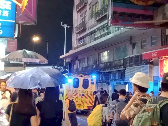 831晚上,銅鑼灣再有示威者受傷,救護車前往現場收治傷患。(黃美珍拍攝)