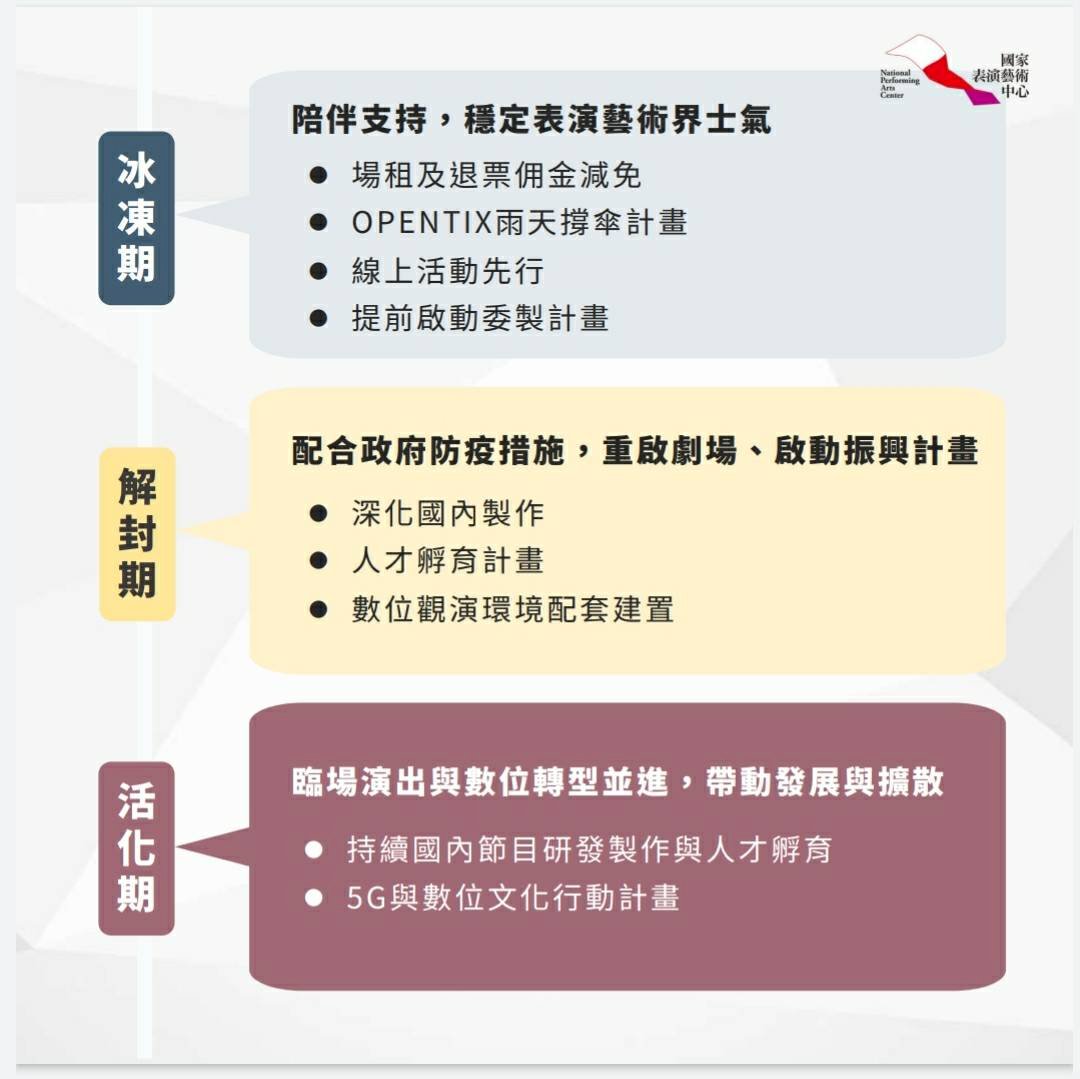 此外,國表藝也積極策動3大推進方案,包括全力投入資源,支持國內製作、深化與研發;強化孵化及人才儲能,擴增數位觀演平台;串連北中南共推數位文化行動計畫,和表演團隊站在一起,一同度過難關。朱宗慶:『(原音)2個支撐跟3個推動裡面就是希望,不是只有在冰凍期,或是過程中在幫你減場租、減少佣金而已,這個是我們要減少他們負擔之外,要全力支持他們製作研發,然後人才、數位、5G串連,這都是我們在做的事。』
