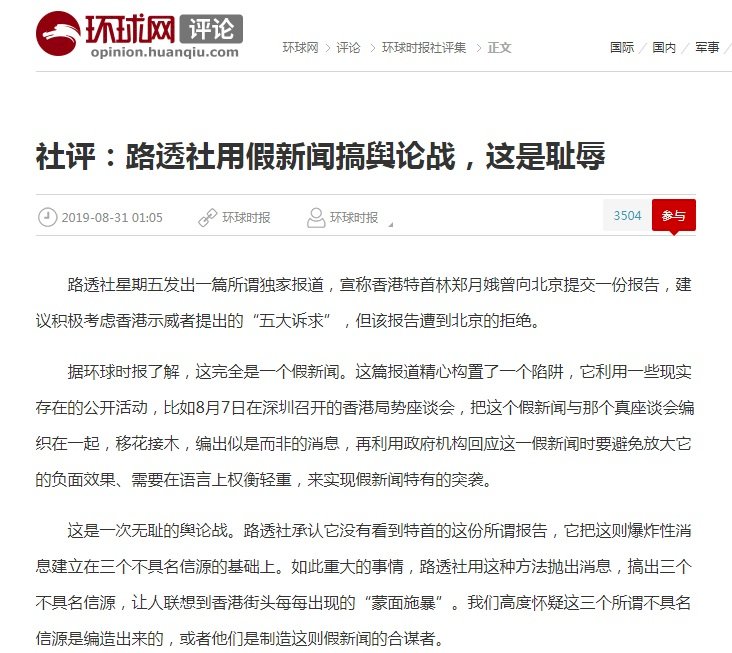 環時批評,「路透社此時編造中央拒絕港府向示威者妥協的假新聞,是要煽動激進示威者更明確地對抗中央,推動香港當前的騷亂在政治指向上進一步升級,給香港事態加注新的破壞性能量」「看上去它是發了一個『獨家消息』,但它實際上是要對局勢做出惡意的引導,給止暴制亂的陣線捅一個窟窿」。