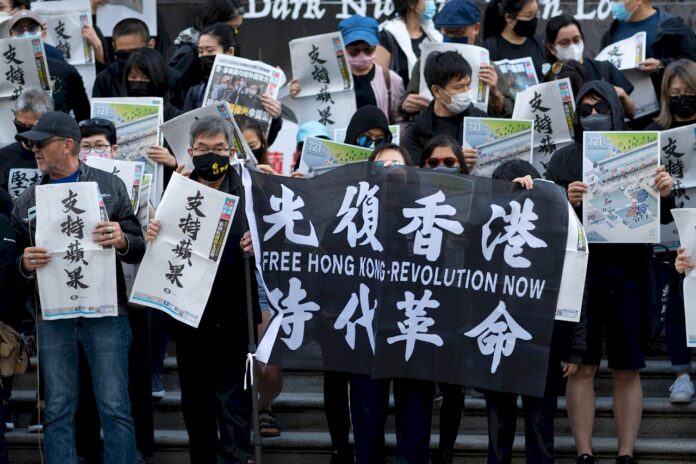 在活動現場,主辦方通過自由捐款的方式分發因為中共政權壓迫而停業的《蘋果日報》,人人手上拿著《蘋果日報》,對中共在香港的鎮壓行動,表達強烈不滿與抗議。