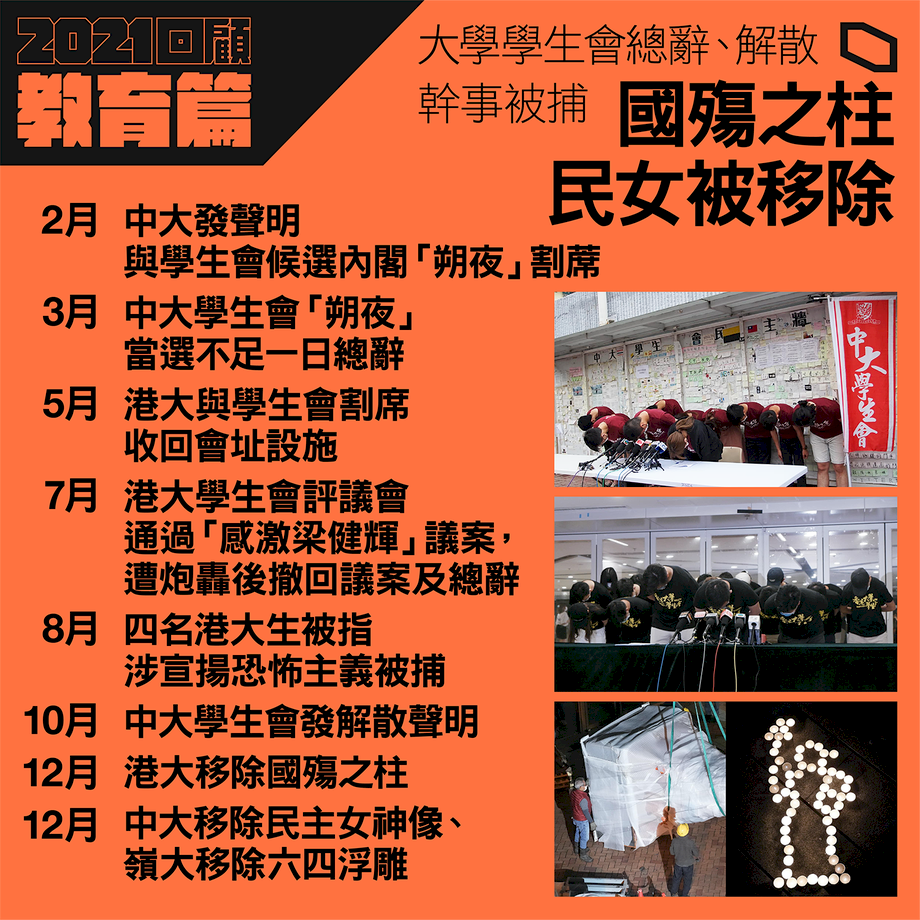 由中文大學學生會內閣「朔夜」被中大校方以「嚴正聲明」割蓆開始,再到港大學生會會長因發表哀悼七一刺警案義士梁健輝先生之聲明(詳見另稿 寫在香港大學學生會總辭之時—— 在獨裁面前 我們都是飽歷風雨的同路人)後被校方不再承認及時任會長郭永皓及三位學生代表更被控「宣揚恐怖主義」,港大中大學生會之倒下令其他大學的管理層繼續「保持隊形」。