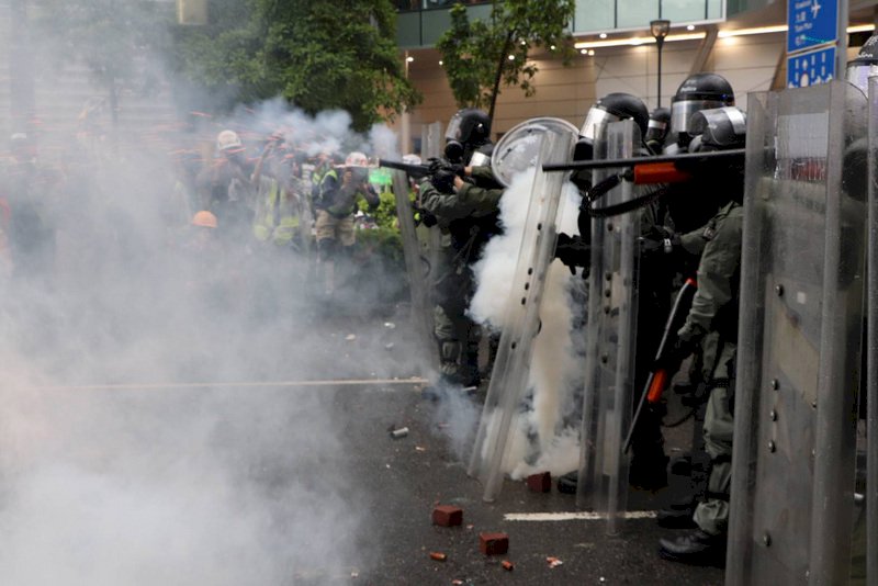 香港掀緊急法呼聲,831反送中遊行恐成關鍵。圖為香港「反送中」支持者25日發起荃葵青遊行,示威者走上馬路與警方對峙,其中有人扔擲汽油彈。警方則以催淚彈還擊。(資料照片/CNA)