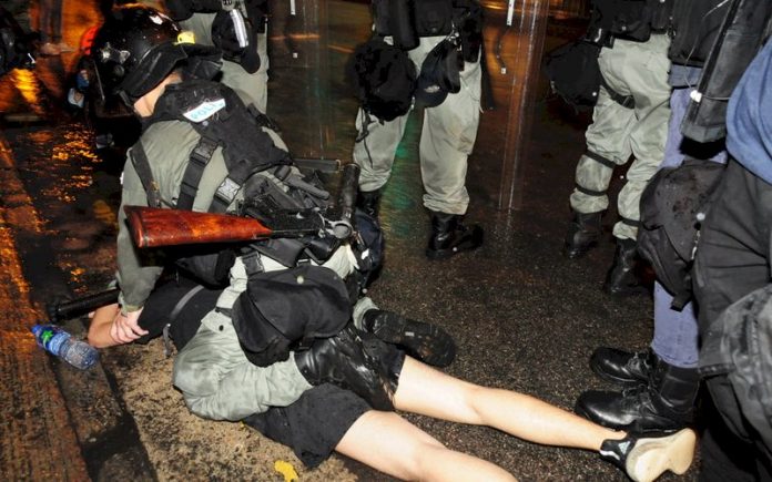 香港網友25日發起荃葵青遊行,之後再度演變為警民衝突。圖為港警晚間在楊屋道上清場,一名示威者被防暴警察壓制在地。(圖:中央社)