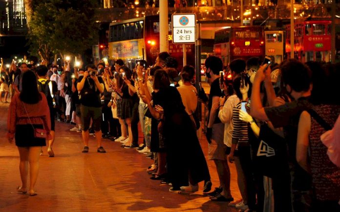 香港23日晚間出現「香港之路」活動,示威者牽手串起人鏈,蔓延全港多區,並在晚間9時左右和平解散。(圖:中央社)