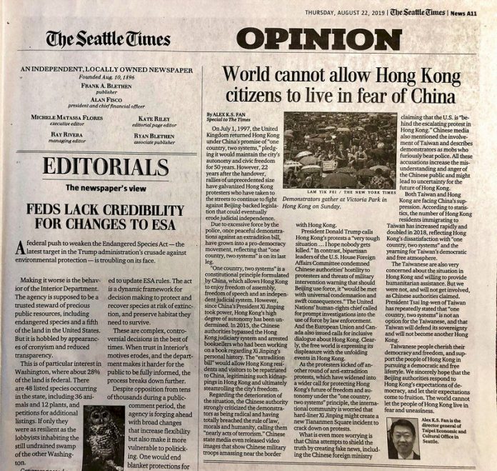 西雅圖時報是美國華盛頓州發行量最大、歷史最久的平面媒體,擁有180萬讀者。22日在第11版的言論版主要欄位,刊登范國樞投書,標題為「全世界不能允許香港市民活在對中國的恐懼中」。