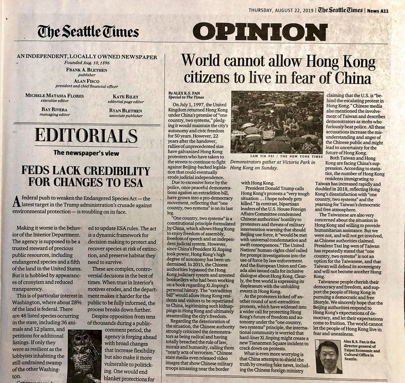 駐西雅圖台北經濟文化辦事處長范國樞投書「西雅圖時報」(The Seattle Times),表達台灣人關注香港局勢,並願意提供人道援助,呼籲北京當局回應人民對民主的期待。
