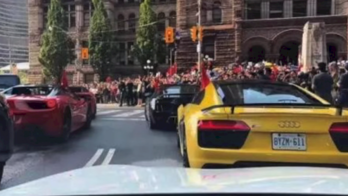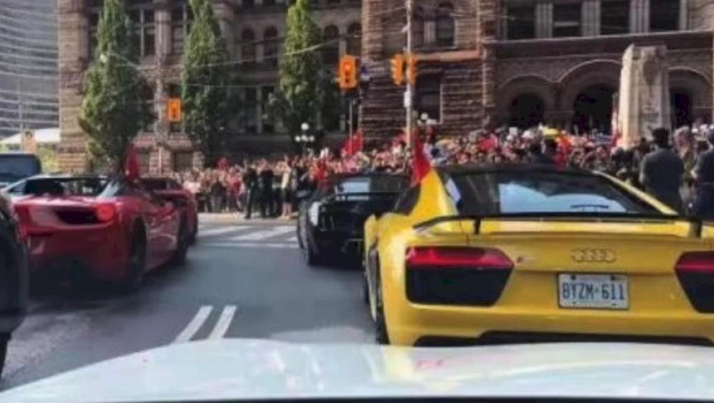 針對香港反送中示威,加拿大中國人挺北京豪車國旗遊行。(視頻截圖/法廣)