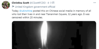 英國駐中使館貼圖悼六四 20分鐘被消失