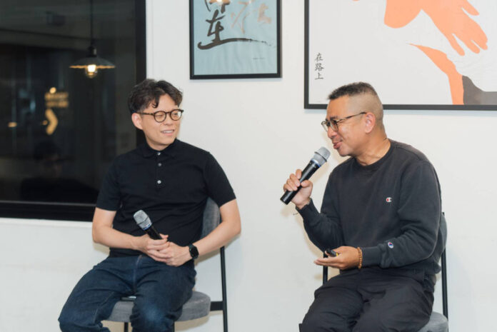 「香港文化在台灣」首場講座以「設計」為主題,8日晚在台灣當代文化實驗場舉行,台灣設計師馮宇(左)、香港設計師毛灼然(右)分別擔任主持人與講者。(台港經濟文化合作策進會提供/圖:中央社)