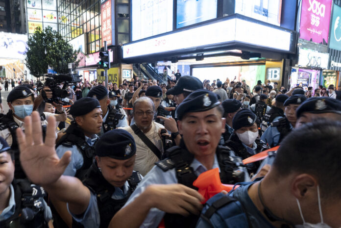 香港警方在六四天安門事件34週年前夕,拘捕了至少4人,當中包括行為藝術家陳式森(中)等人在內。陳式森在被警員帶走時,激動高喊:「不忘六四!香港人唔好驚!」(AFP)