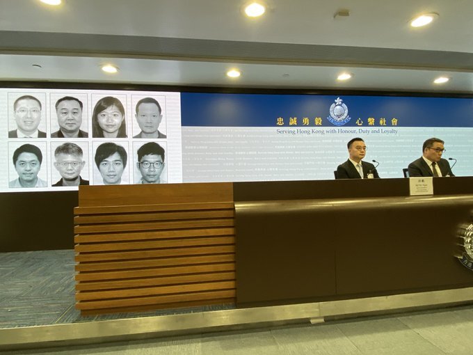 香港國安處日前召開記者會宣布,懸賞100萬港幣通緝8名民主派與反送中異議人士。(Twitter/@XinqiSu)