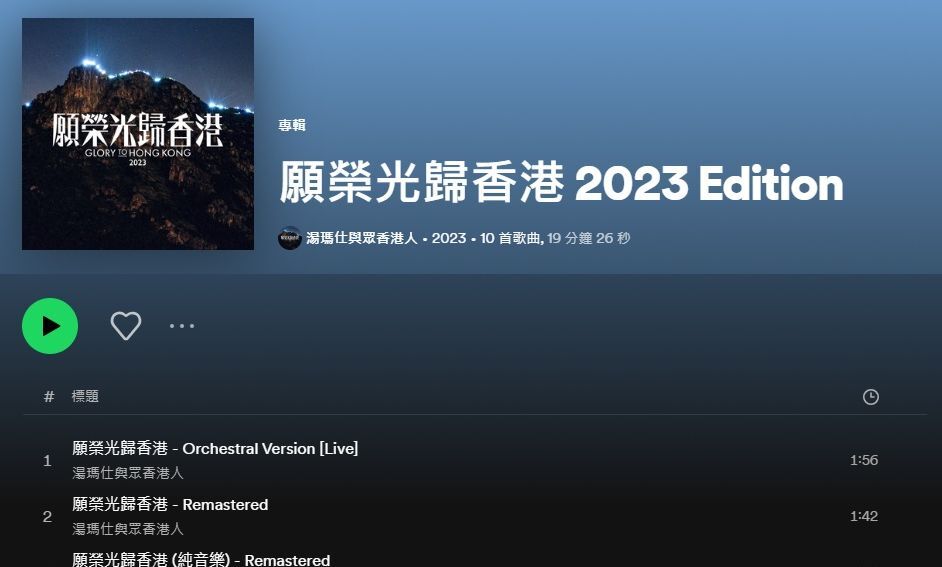 反送中名曲「願榮光歸香港」重新上架。 (圖:翻拍自Spotify)