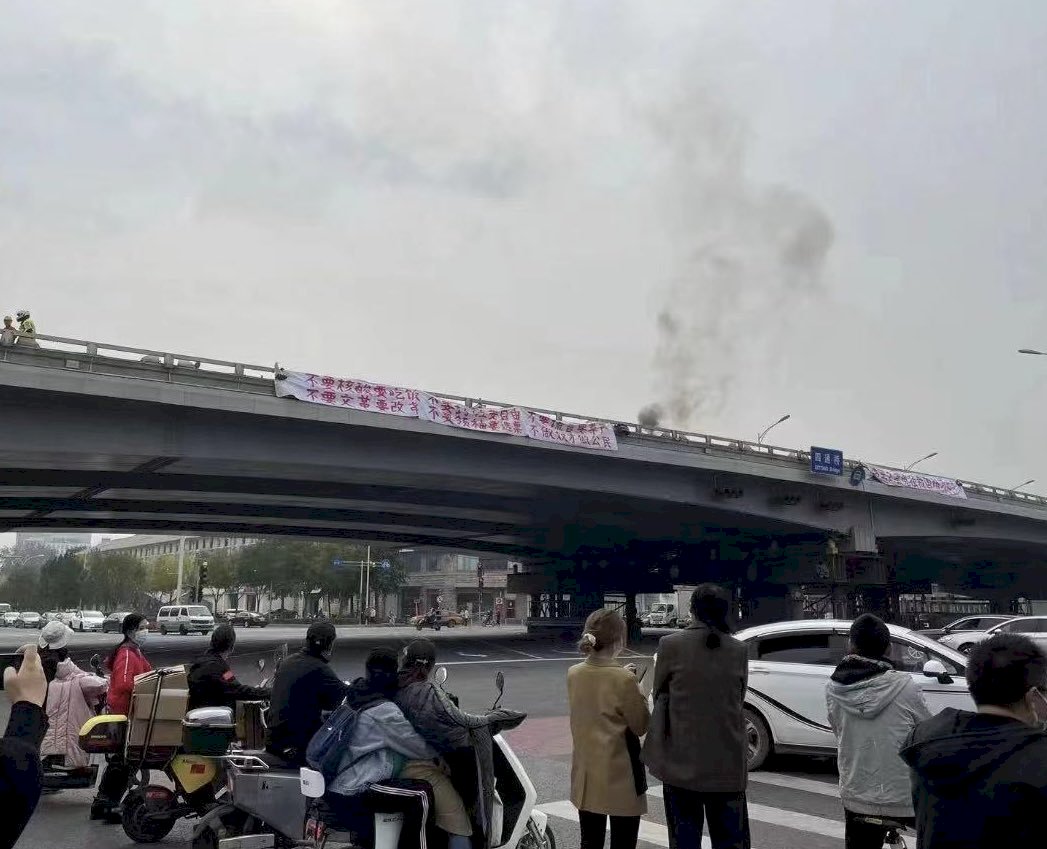 中共20大敏感時刻,北京海淀區四通橋上13日突然出現兩幅大面抗議布條,吸引許多路過民眾觀看、拍攝。(Twitter)