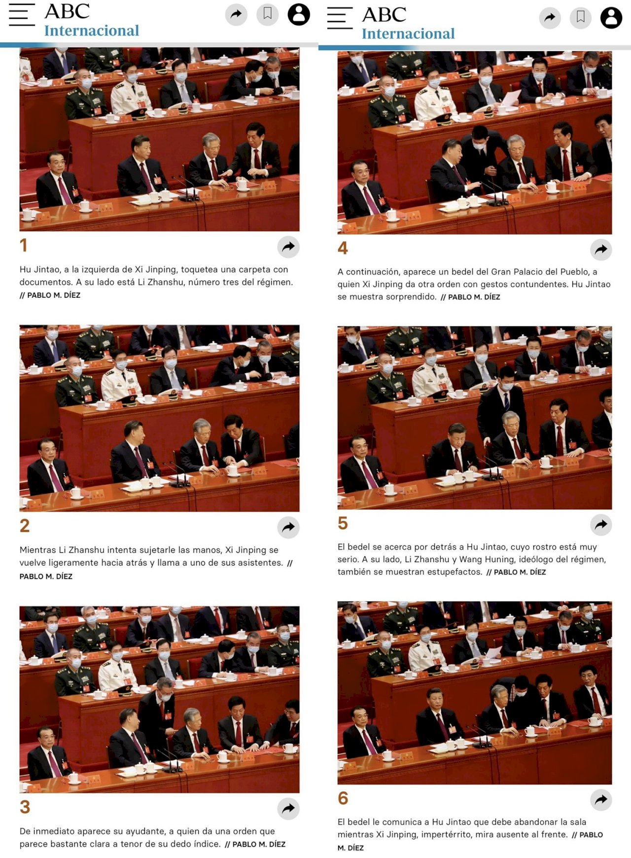 胡錦濤究竟因何事被帶離會場,已成為國際媒體熱議話題,西班牙ABC報最新公布更多細節,其記者拍攝到胡被離場前更早且更完整的14張相片顯示,似乎導火線與20大相關文件有關。