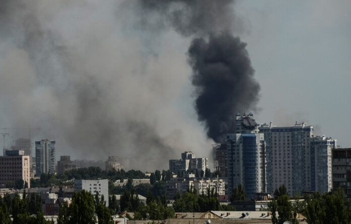 俄羅斯8日對烏克蘭進行攻擊,基輔遭受俄羅斯飛彈襲擊後,城市上空煙霧彌漫。(路透社/達志影像)